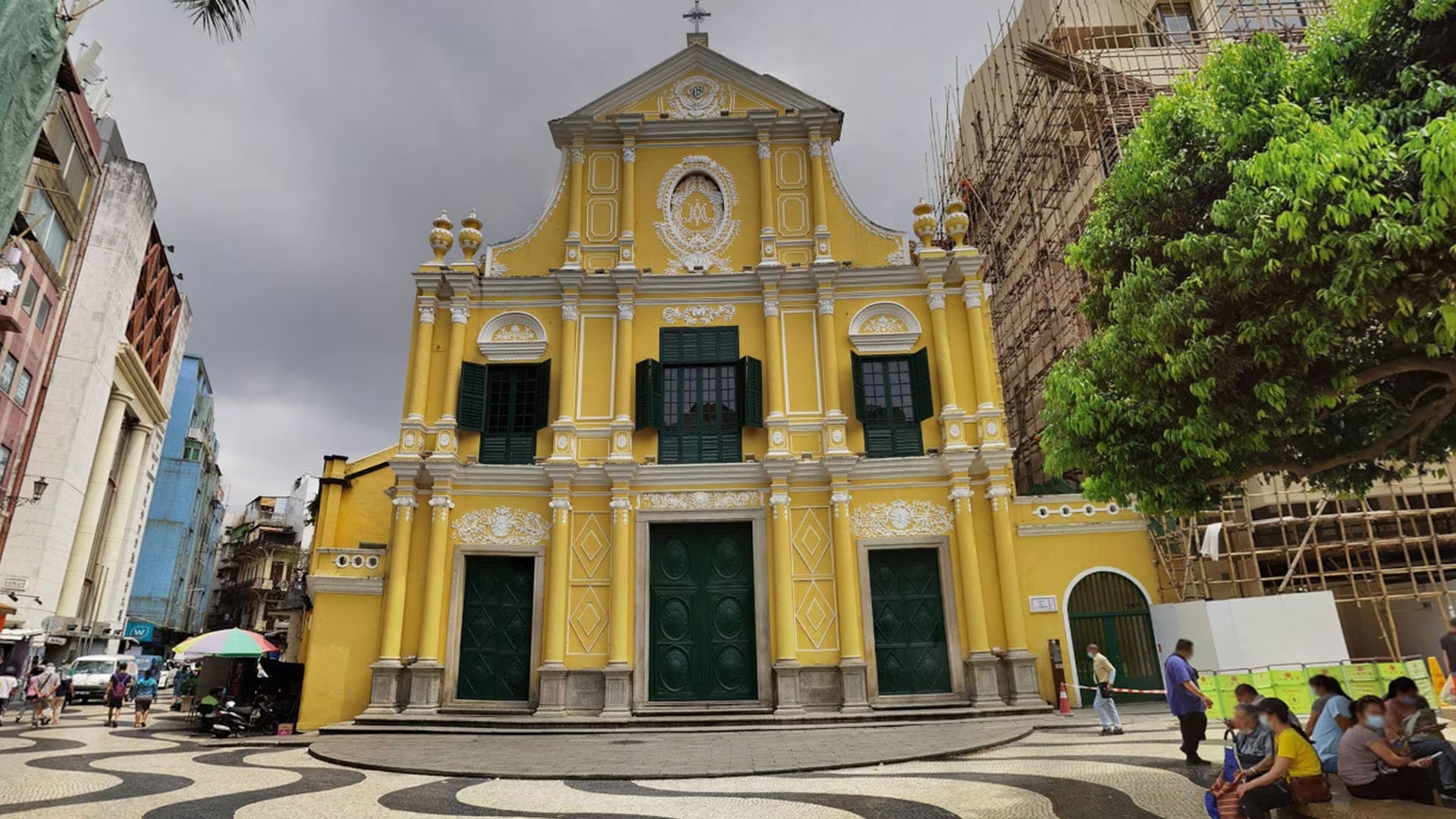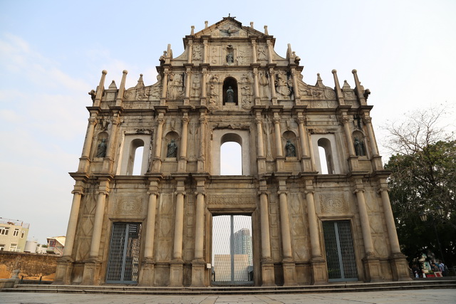 聖保羅教堂被一場大火燒毀,僅殘存了的前壁部分,因為它的形狀與中國傳統牌坊相似,所以取名為大三巴碑坊;牌坊頂端高聳的十字架,及銅鴿下面的聖嬰雕像和被天使、鮮花環繞的聖母塑像,充滿著濃郁宗教氣氛。